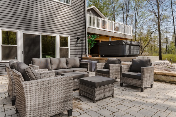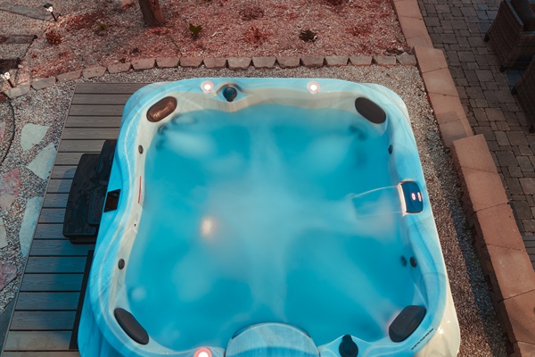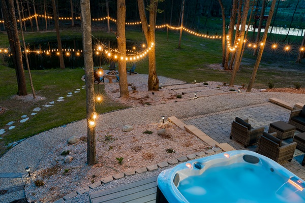 Relax in the private hot tub surrounded by trees – the perfect end to any day.