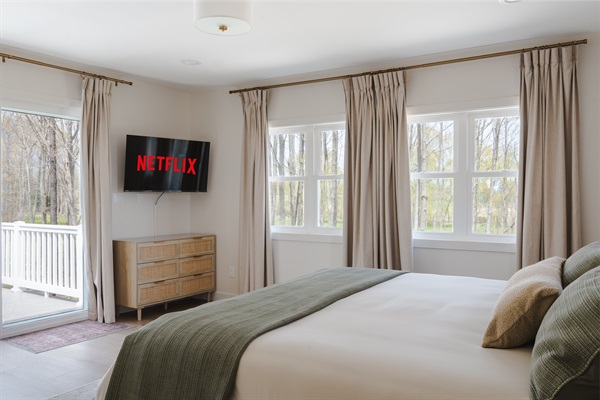 Bright and airy king bedroom with TV, outdoor sitting area, and sliding doors that let you step straight into nature.
